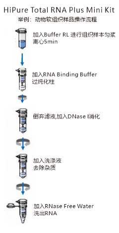 本試劑盒采用玻纖濾膜純化持術和DNA酶,只需進行簡單的結合-洗滌-洗脫的步驟。樣本在含胍鹽的裂解液進行破碎和勻漿,加入乙醇以提供合適的結合條件,然后將裂解物轉移至純化柱并離心, 高達100μg的RNA可被選擇性結合到膜上,污染物經(jīng)三次清洗被高效洗去,最后純化RNA被RNase Free Water洗脫出來。 |