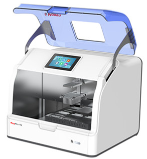 Magmix 96全自動(dòng)高通量核酸提取儀采用磁棒拍打和轉(zhuǎn)移方式,使待檢樣本在合適的條件下自動(dòng)進(jìn)行裂解、核酸與磁珠結(jié)合、磁珠轉(zhuǎn)移和分離、 洗脫釋放,從而實(shí)現(xiàn)從樣本中分離提純核酸。與其他提取方法相比,Magmix系列全自動(dòng)核酸提取儀配套預(yù)分裝試劑操作更為簡(jiǎn)便快捷,可實(shí)現(xiàn)全自動(dòng)化核酸提取。該儀器可同時(shí)進(jìn)行1-96個(gè)樣本的提取,用戶只需通過觸摸屏的簡(jiǎn)單操作就可實(shí)現(xiàn)實(shí)驗(yàn)程序編輯、實(shí)驗(yàn)狀態(tài)監(jiān)控、開關(guān)紫外 燈消毒等功能,具有操作簡(jiǎn)便、提取快速、結(jié)果可靠的特點(diǎn) Magmix 96核酸提取儀采用96孔深孔板和96磁套作為提取耗材,深孔板底部和加熱模塊充分接觸,大大提高孔間的溫度均勻性,從而減少了提取造成的孔間差異。 Magmix 96核酸提取儀配合相應(yīng)的磁珠法核酸提取試劑,可以快速提取動(dòng)植物組織、血液、體液、食品、病原微 生物等樣品中的DNA和RNA。提取儀用于生物樣本的核酸提取純化,適用于臨床檢測(cè)、常規(guī)科研、基因組學(xué)分 析、疾控系統(tǒng)、食品安全檢驗(yàn)、法醫(yī)鑒定等領(lǐng)域。 |