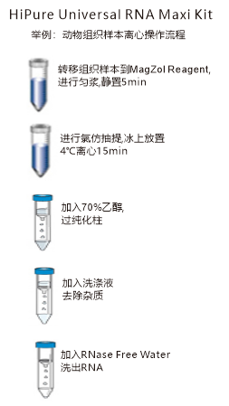 HiPure Unviersal RNA Kits將經(jīng)典的一步法RNA抽提試劑和硅膠柱純化方式相結(jié)合,可大大提高RNA的純度和樣品的廣泛性。純化RNA可直接用于RT-PCR,芯片分析,第二代測序,cDNA文庫構(gòu)建等運用。組織/細(xì)胞樣品經(jīng)一步法RNA抽提試劑(MagZol Reagent)勻漿,加入氯仿抽提去除基因組DNA和蛋白質(zhì),得到的上清液與乙醇混勻后,轉(zhuǎn)移至RNA柱子中進一步純化RNA,經(jīng)洗滌液去除雜質(zhì)和鹽分,最后用DEPC水洗脫出高純度的RNA。HiPure Unviersal RNA Maxi Kit適合于從小于1g動物組織,植物組織,真菌樣品,細(xì)菌,細(xì)胞等樣品中提取高達5mg的總RNA。