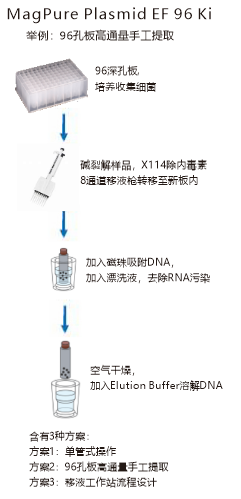 | 本試劑盒采用磁珠純化技術(shù),適合于從1-5ml培養(yǎng)液中提取高達(dá)15ug的質(zhì)粒DNA。得到的質(zhì)粒DNA可用測(cè)序、酶切、連接,克隆,PCR等應(yīng)用。提取過程無需接觸有毒酚氯仿有機(jī)物抽提,也需要用到耗時(shí)的離心步驟。高通量提取操作可以通過96孔磁力架和96振蕩儀實(shí)現(xiàn),可以核酸提取儀上(如KingFisherFle, MagMix32, MagMix 96)進(jìn)行高通量提取,還可以配合移液工作站(Hamilton, Tican)進(jìn)行自動(dòng)化提取。整個(gè)提取可以在80分鐘內(nèi)完成。 |