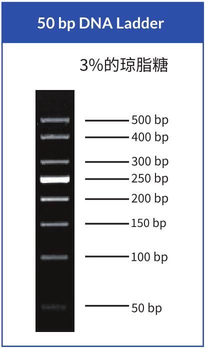 | 本產(chǎn)品由大小分別為500 bp、400 bp、300 bp、250 bp、200 bp、150 bp、100 bp和50 bp共8條雙鏈DNA組成,可作為瓊脂糖凝膠電泳或聚丙烯酰胺凝膠電泳中雙鏈線狀DNA分子量大小的參照。其中250 bp為指示帶,濃度約為150 ng/5 μL,其余條帶濃度均為50 ng/5 μL。本品已混有上樣緩沖液,可直接用于電泳。 |